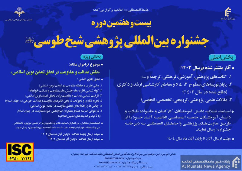 فراخوان بیست و هفتمین دوره جشنواره بین المللی پژوهشی شیخ طوسی از سوی پژوهشگاه بین المللی المصطفی منتشر شد.