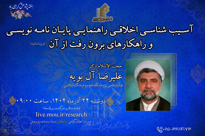 برنامه های هفته پژوهش: کارگاه علمی با عنوان: آسیب شناسی اخلاقی راهنمایی پایان نامه نویسی و راهکارهای برون رفت از آن