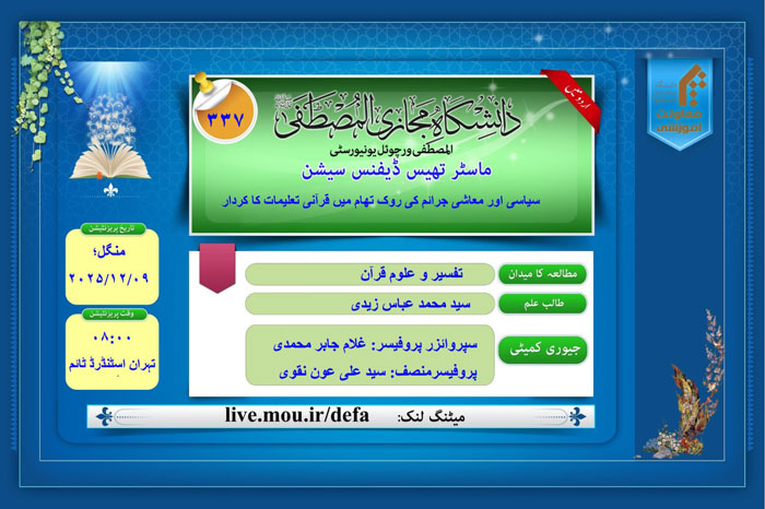 جلسه دفاع از پایان‌نامه کارشناسی ارشد با عنوان: نقش آموزه‌های قرآنی در پیشگیری از جرایم سیاسی و اقتصادی (به زبان اردو)